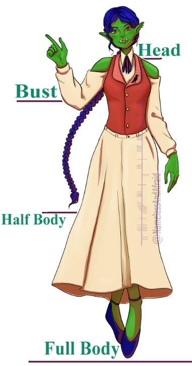A rush fee of €10 (per piece) will be charged for tight deadlines.A design fee will be charged for clients with no reference images that would like me to draw solely from a description and/or a collection of photos.Additional fees will be charged for excessive or major revisions (see “Revisions” below).The exact prices for the fees described above will be dependent upon the complexity of the commission.III. CLIENT OBLIGATIONSWrite in a clear and concise manner when making the request.Ensure my art style is what you are looking for in the depiction of your idea's!State you have read and understand the terms of the Tos and let the artist know by use of the nerd emoji 🤓.Please ensure you have a form of contact which images can be shared, and an email or discord for quality images to be sent upon completion.Provide multiple clear reference images of the character/subject.Mood boards, Gacha, picrew, The Sims, any character designer is welcome! Ai however is not, so please ensure you do not send AI as a reference and if you are not certain you may ask me to check it over.Maintain professional conduct throughout the commission process.Respond in a timely fashion.Assume responsibility for any important information and clear descriptions/references you fail to provide me that results in my inability to complete your commission to your full satisfaction.Carefully read through the ToS and Commission Information.IV. PROCESS & WORK SCHEDULEResolution of the art will depend on my pc's processing ability but if you have a size requirement you may request it (I mainly work between 2000px-4000px); may be slightly larger or smaller depending on the work. Largest resolution (up to 5000 x 5000 px) is available upon request for an additional fee of €5.I will send over a sketch for approval before continuing the commission. You have the option of three revisions to ensure the piece is to your satisfaction, any more will result in additional fee's. See below.I will show WIPs via the chosen form of contact throughout the commission process.Sketch and subsequent in-progress shots will initially be sent as low-res, watermarked images.Deadlines must be agreed upon prior to the start of the commission. I can get most works done in a 2-4 weeks period, however this is subject to change and I can only ask you understand and don't come into this with a strict deadline in mind. Unless paid for as stated above.I will always do my best to complete your commission within a timely manner, but please understand that sometimes life may get in the way and cause a delay in completing your commission. I will notify you as soon as possible of any issues that come up to keep you informed.V. REVISIONSOne major revision and multiple minor revisions are allowed in the sketch phase and are covered in the commission price.A limited amount of minor revisions are allowed in colouring/painting stage and are covered in the commission price.Excessive revisions to the point that forward progress on the work has halted will incur additional fees of €5 per revision.Revisions due to my own negligence are of course free.It is up to my discretion as to what constitutes minor and major revisions.VI. COPYRIGHT & USAGE POLICYI, the artist, retain the rights over any commissioned works.I reserve the right to post the commissioned work or process on my social media tagged as a commissioned work.I reserve the right to stream, record, and upload videos of the creation of the artwork.Any characters portrayed in the commissioned work remain copyrighted to their rightful owners.The final product is strictly for your personal and social media use only.You must credit and link back to me/tag me when sharing or using the commissioned work.I currently do not offer my services for commercial use.You may use or edit the commissioned work in the following ways:Print the work for personal use.Crop and/or resize the image for use as an avatar, header, video thumbnail, etc.Use the artwork as reference for a study.Post the artwork on social media, with credit to me clearly visible.You may NOT use or edit the commissioned work in the following ways:Claim the artwork as yours.Remove my watermark/signature.Paint over or otherwise alter the artwork in ways not covered under the allowed uses above.Colour in my sketches or lineart.Use the commissioned piece in any technology related to NFTs, cryptocurrency, or AI.Reproduce the work commercially.VII. CANCELLATION AND REFUNDSOnce the final product is approved, a refund is not permitted.If you had paid 100% up front, only 50% will be refunded if the first half of the process has already been begun.If paid via a 50%/50% agreement, payment is non-refundable after the work process has begun.I reserve the right to cancel and refund the money for your commission at any time. If I choose to cancel and refund I will refund in full due to it being of my own choosing and my own time.You may not file a chargeback against me after you have given approval of the artwork.VIII. WHAT YOU RECEIVEYou will receive the following after client approvals at the appropriate stages of the commission process. Images are always sent as a PNG type file unless another resolution/file type is requested. Note, the work file (CSP file) is not an available form of file.
